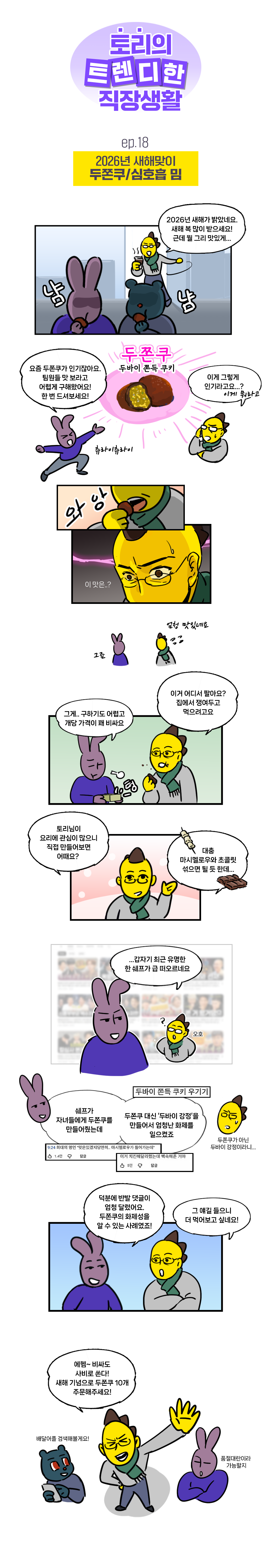 [토리의 트렌디한 직장생활] 18탄. 지금 대한민국은 '두쫀쿠' 열풍 중! 콘텐츠 · 펀&조이 2026.01.26 url 공유하기 페이스북 트위터 <p><img alt="" src="https://channeln.gcdn.netmarble.com/channeln/Upload/ed91643c-6062-4878-9973-ee1f8249a22b.png" style="width: 1000px; height: 5785px;" /></p> <p style="text-align: center"><img alt="" src="https://channeln.gcdn.netmarble.com/channeln/Upload/6fe287de-154b-4e4d-986d-8e0733d543bf.png" style="width: 1000px; height: 5074px;" /></p> <p style="text-align: center">지금 대한민국은 '두쫀쿠' 열풍 중!<br /> 두쫀쿠에 푹 빠진 토리와 함께<br /> 2026년 병오년에도 트렌디한 한 해 보내세요! </p> <p style="text-align: center"><img alt="채널 넷마블 편집팀" class="Byline" src="/Images/Web/Sub/byline_keke.png" /></p> 지금 대한민국은 '두쫀쿠' 열풍 중! 두쫀쿠에 푹 빠진 토리와 함께 2026년 병오년에도 트렌디한 한 해 보내세요!