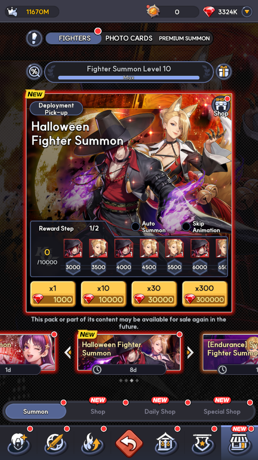 You can grab both fighters in the “Halloween Fighter Summon” event running until November 5. Summon with Rubies or Spooky Fighter Tokens, and cumulative summons guarantee a Halloween-style fighter. Just like before, the event opens from Summon Level 3.