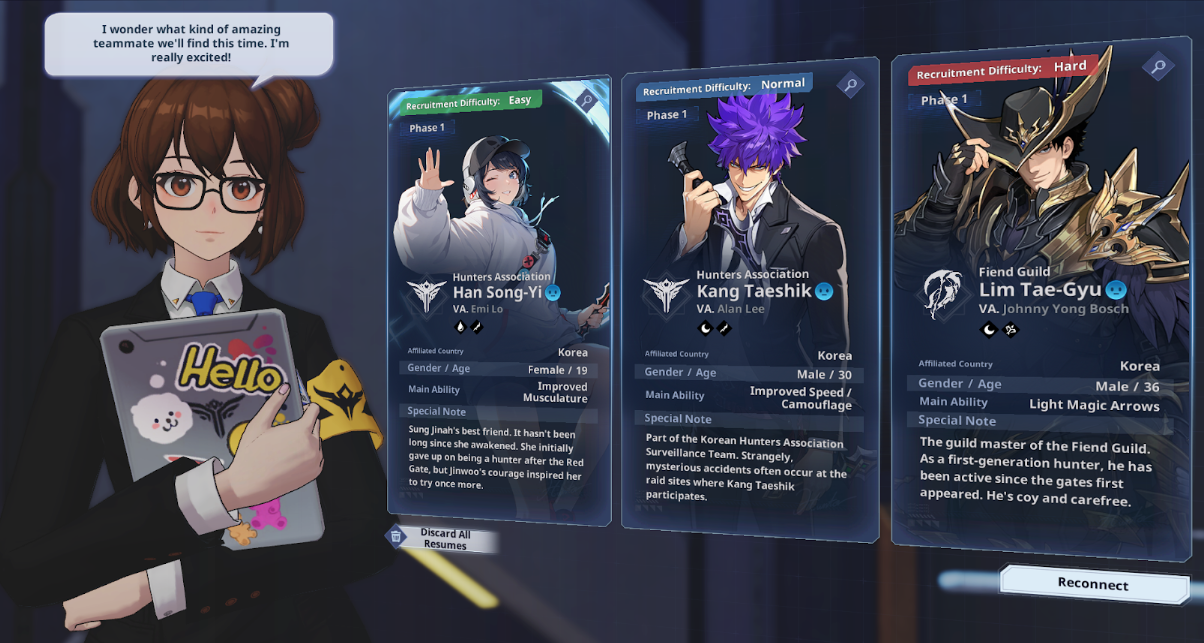 The part of the lobby that stood out most to me was the Recruitment system, where players can bring Hunters on board to support Sung JinWoo.