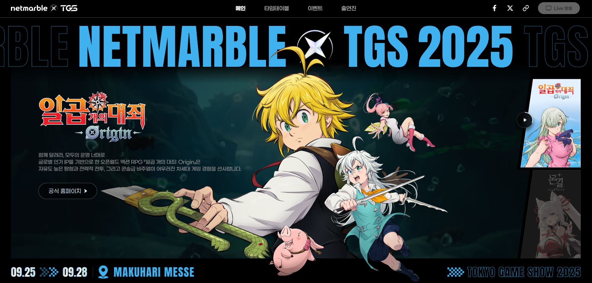 넷마블이 9월 25일부터 28일까지 일본 치바 마쿠하리 멧세에서 열리는 ‘도쿄게임쇼 2025(TGS 2025)’에 단독 부스로 참가합니다! 넷마블이 TGS에 단독 부스로 참가하는 것은 이번이 처음인데요! 넷마블은 TGS 2025를 통해 신작 ‘일곱 개의 대죄: Origin’, ‘몬길: STAR DIVE’ 선보이며 관람객의 시선을 사로잡는 대형 조형물을 내세워 부스가 꾸며질 예정입니다. 넷마블 TGS 2025 특설 사이트를 오픈하고 부스 디자인과 주요 현장 프로그램을 공개하여 유저들의 큰 기대감을 모으고 있죠.