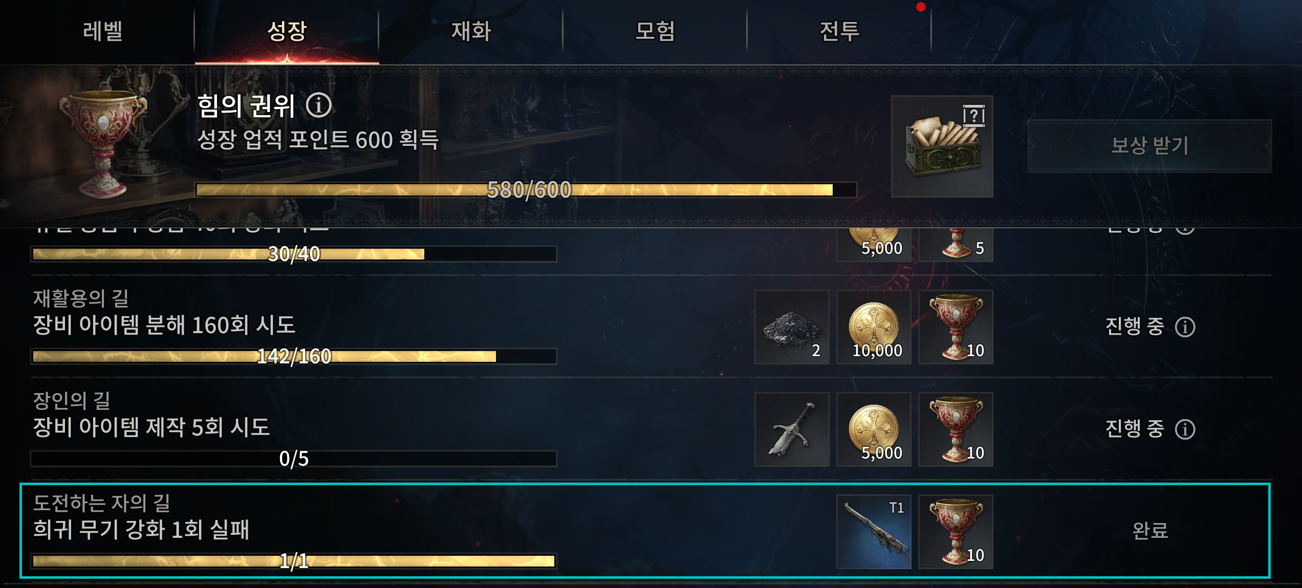 조금 덧붙이자면, 희귀 등급 아이템은 대부분 여러분이 직접 장착하는 주력 장비로 쓰이는 반면, 고급 등급 아이템은 대체로 컬렉션을 완성하기 위한 재료로 활용되는 경우가 많습니다. 일정 수준 이상 강화를 마친 아이템을 넣어야 하는 경우가 대부분이므로 희귀 등급 아이템 획득 전까지 사용할 고급 등급 아이템들은 강화 재료가 아깝다는 생각하지 말고 강화한 후 사용하시길 바랍니다. 덧붙여 첫 번째로 얻는 ‘희귀 등급 무기’는 안전 강화 이상으로 강화를 시도해보길 바랍니다. 파괴되더라도 업적을 통해 새 희귀 등급 무기를 얻을 수 있기 때문이죠.