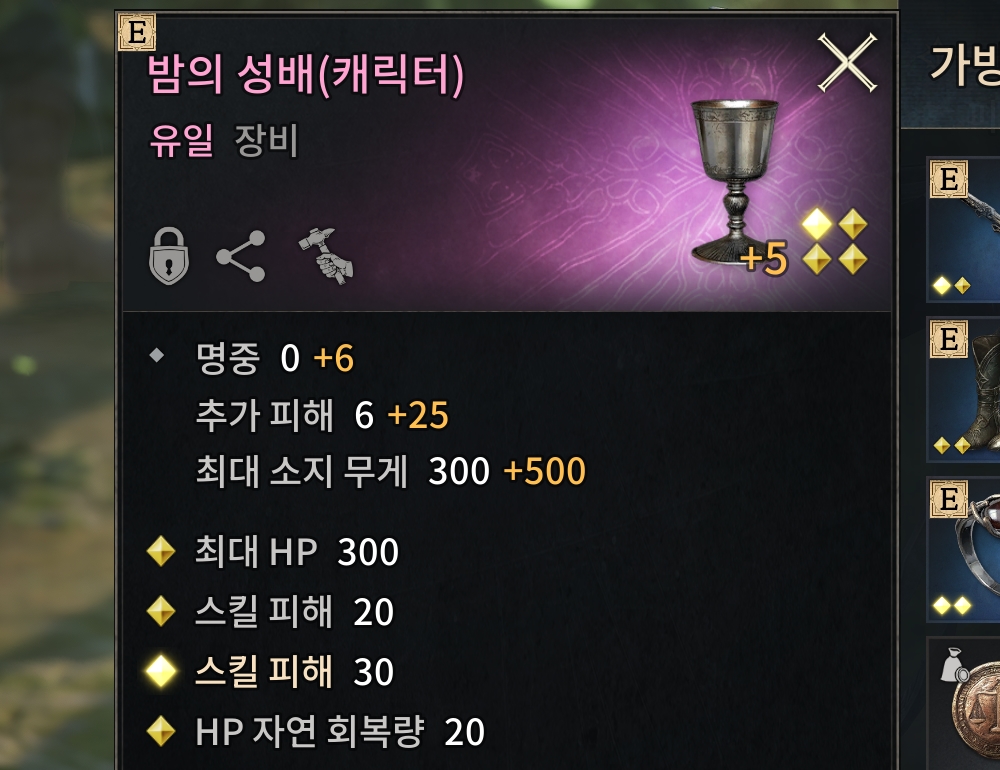 여기에 추가로 ‘부장품’이라는 특수 장비도 존재하는데요. 크게 밤의 향기, 밤의 성배, 밤의 유언 3종이 있습니다. 이들은 다른 장비와 마찬가지로 캐릭터 기본 능력치를 향상시키는 옵션을 보유하면서 각각 ▲경험치 추가 획득 ▲최대 소지 무게 ▲MP 자연 회복량 등 게임 진행을 원활하게 하는 부가 효과를 제공합니다. 참고로 밤의 향기는 35레벨, 밤의 성배는 40레벨, 밤의 유언은 52레벨 이상부터 획득할 수 있습니다.