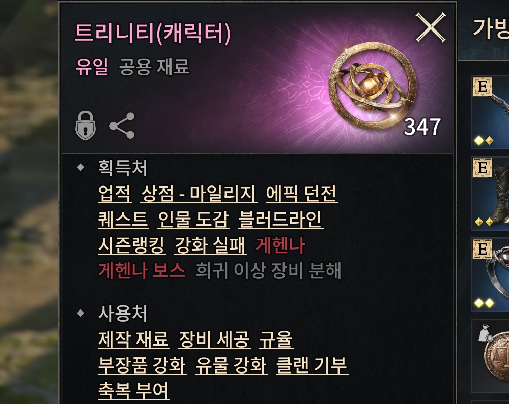 그리고 이런 세공에는 일반 재화인 ‘골드’와 공용 재료 ‘트리니티’가 필요합니다. 트리니티는 공용 재료라는 이름에 걸맞게 제작, 세공, 규율, 부장품 강화, 유물 강화, 클랜 기부, 축복 부여 등 다양한 분야에서 쓰입니다. 사용처가 많은 만큼 획득 가능한 콘텐츠도 다양하지만 필요한 수량에 비해 공급량은 부족한 편이죠. 무·소과금이라면 더욱 더 선택과 집중을 할 필요가 있습니다. 트리니티 사용처 중 부장품 강화는 캐릭터 전투력을 확정적으로 향상시킬 수 있는 안전 강화 단계 +3까지는 필수로 진행하는 것을 추천합니다. 그 이상 강화는 파괴 위험이 있으므로 부장품 추가 획득에 따른 선택의 영역이죠. 또, 세공과 규율은 일정 확률에 따라 추가 능력치가 붙는 시스템인 만큼, 최상의 결과를 내기 위해선 반복적으로 시도할 수밖에 없는데요. 한 번에 모두 소진하기보다는, 다른 콘텐츠들을 위해 적절한 트리티니의 분배가 필요합니다.