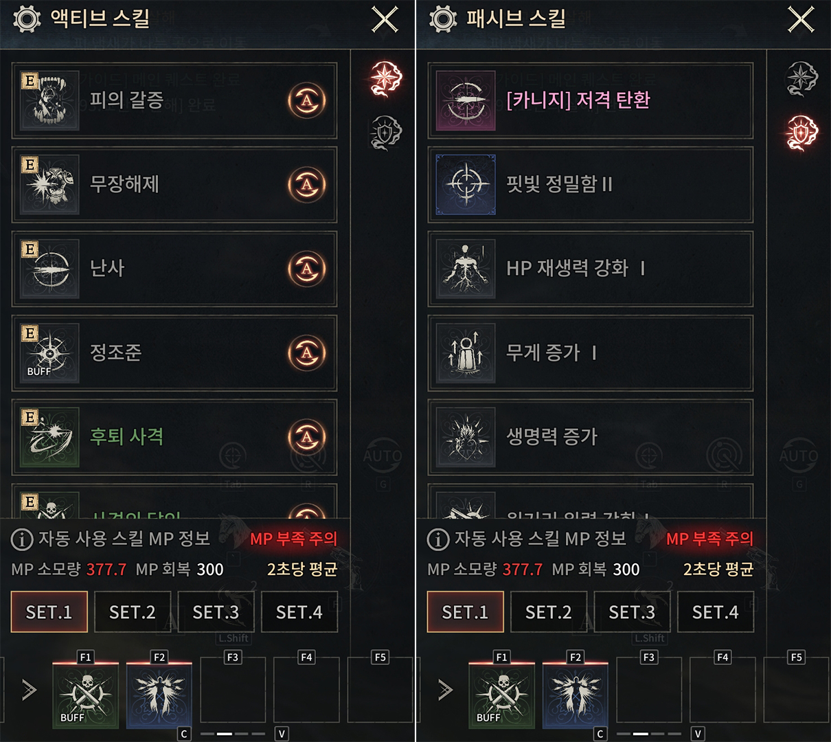 액티브 스킬과 패시브 스킬로 구분되어 있으며, 종류가 다양합니다