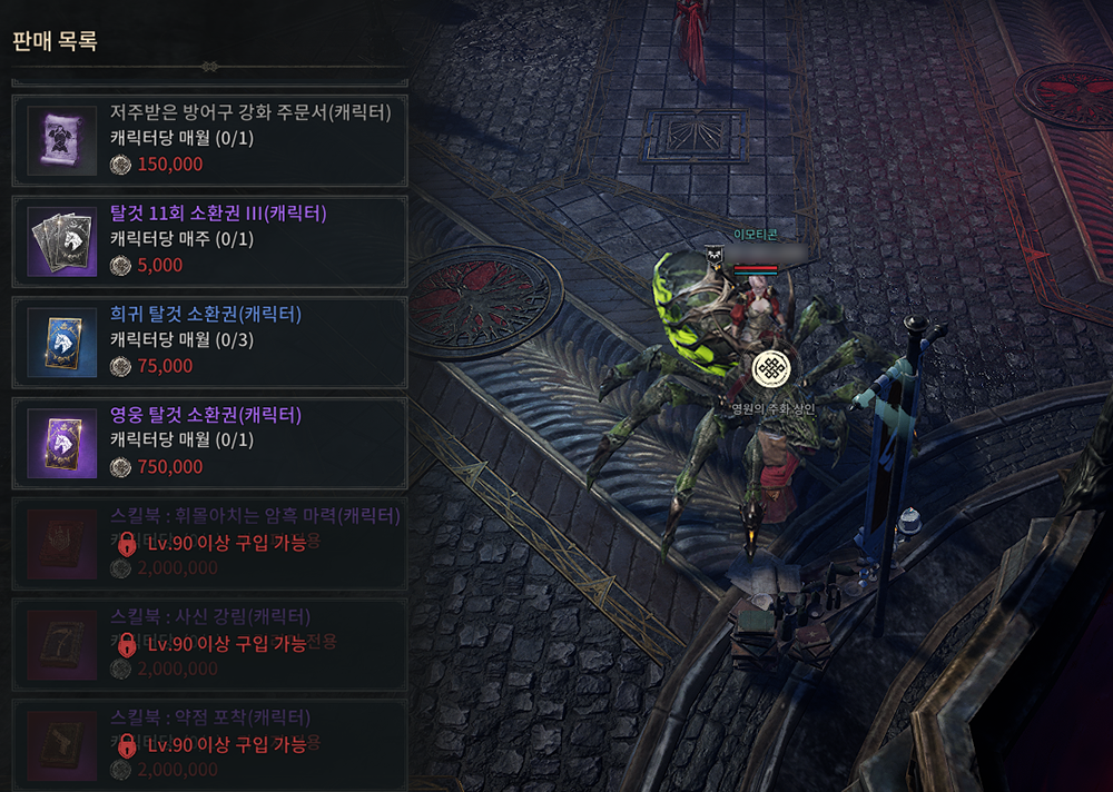 ‘마을상점’은 거점에 있는 스킬북 상인, 영원의 주화 상인, 클랜 주화 상인을 가리킵니다. 클랜 주화 상인은 클랜 활동으로 얻게 되는 ‘클랜 주화’를 요구하며, 영원의 주화 상인은 업적, 퀘스트, 던전, 월드 보스, 아카이브 등 다양한 게임 플레이를 통해 획득할 수 있는 ‘영원의 주화’를 요구하죠. 마지막으로 스킬북 상인은 일반 재화 ‘골드’를 요구합니다.