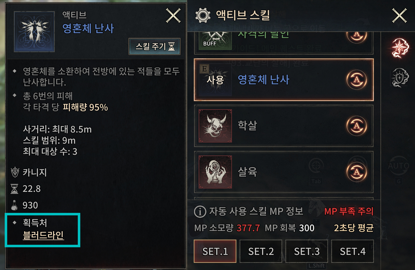 보통 획득처가 ‘퀘스트’로 표기된 스킬은 특정 메인 퀘스트 클리어를 통해 확정적으로 얻을 수 있죠. 다음으로 ‘블러드라인’은 플레이어가 선택한 클래스의 시조가 되는 선지자 4인에 대한 배경 스토리를 다룬 사이드 퀘스트로 메인 퀘스트를 일정 단계 클리어할 때마다 도전할 수 있으며 클리어 시 클래스 전용 스킬북을 얻을 수 있습니다. ‘고대의 공방’은 매주 기본 8시간씩 이용할 수 있는 일반 던전으로 이곳에서 사냥 시 일정 확률로 스킬북을 획득할 수 있습니다.