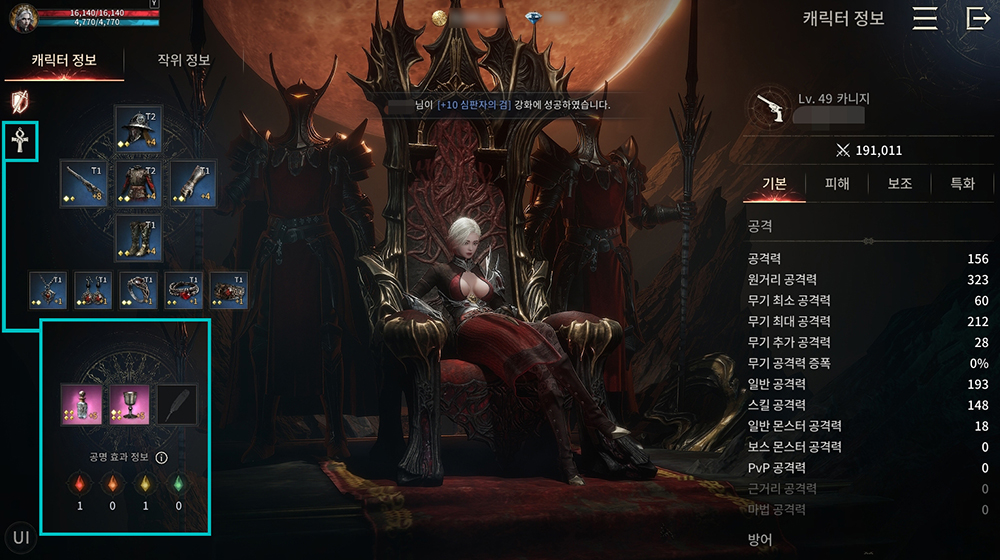 위에서 말한 장비들을 보다 높은 등급으로 확보하거나, 아니면 강화를 통해 전투력을 올리는 것이 가장 기초적인 방법이라 할 수 있습니다. 일단 무기는 +6, 방어구는 +4, 장신구와 부장품은 +1까지는 100% 안전 강화가 제공되지만, 그 이후로는 파괴의 위험이 있는데요. 그래도 하이리스크, 하이리턴이라는 말처럼, 일정 수치 이상 강화에 성공하면 추가 능력치가 제공됩니다.