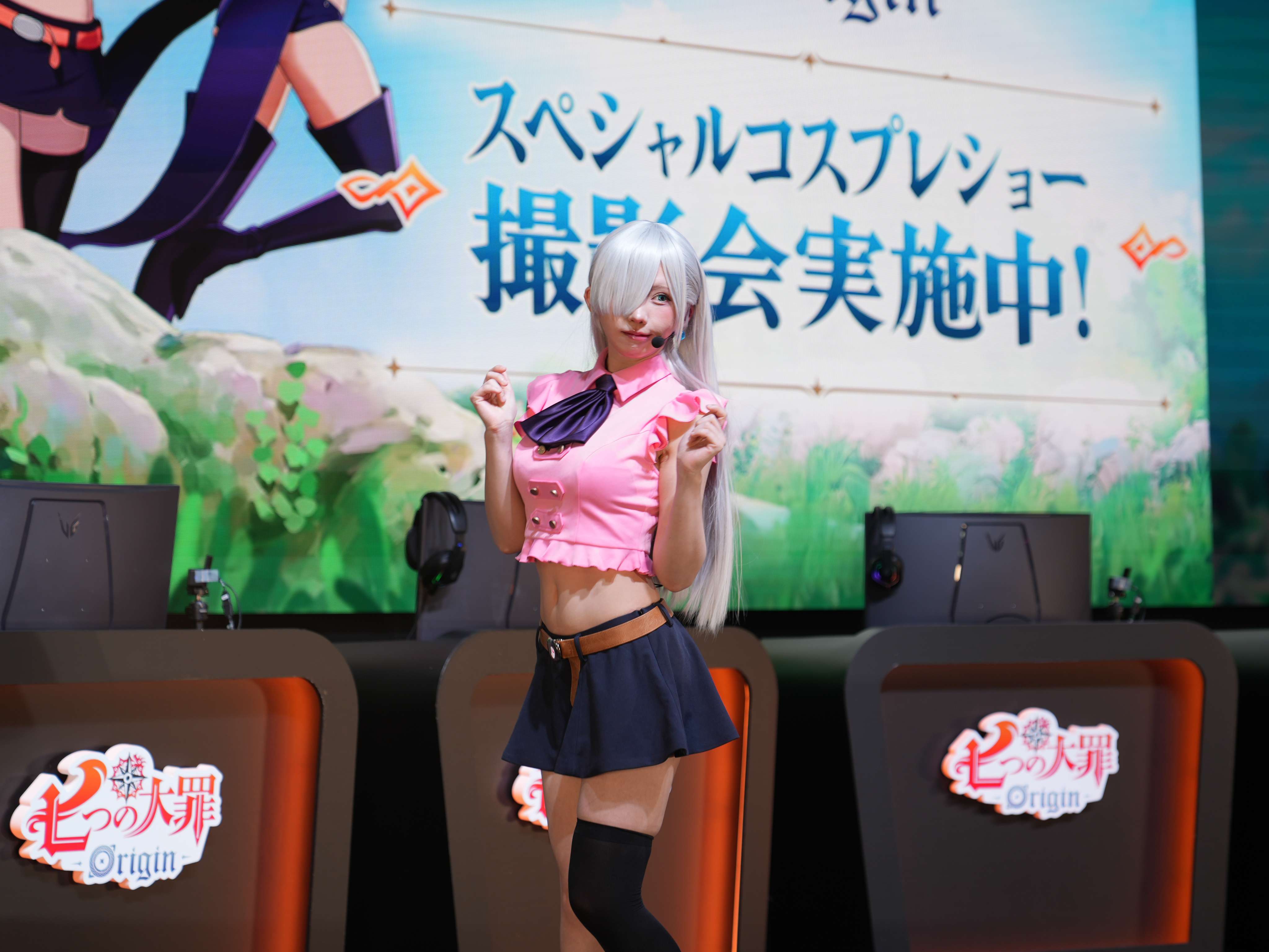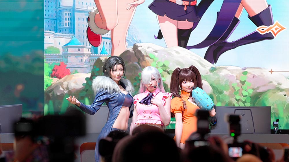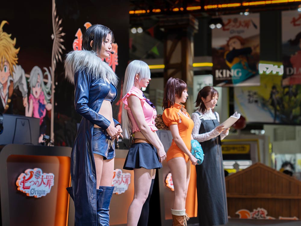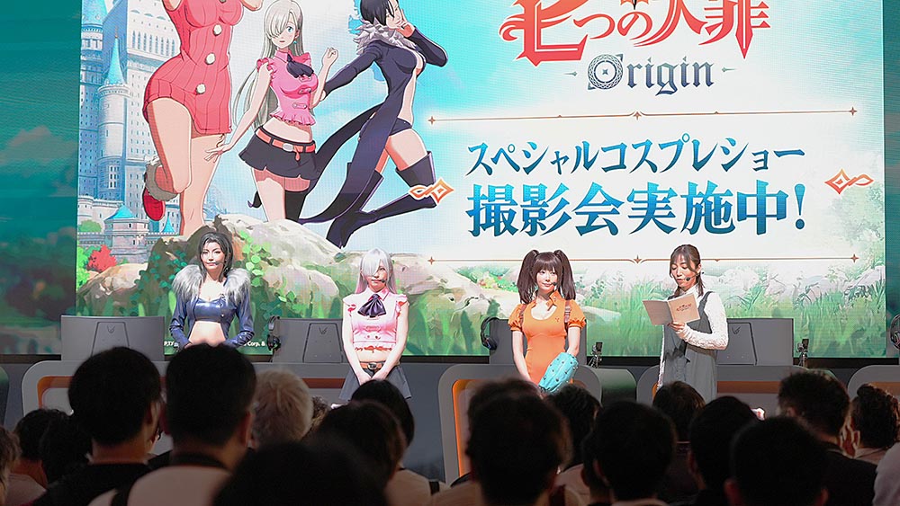 부스 중앙에 마련된 무대에서는 오전 10시 45분부터 오후 2시까지 TGS 통신, 스페셜 코스프레쇼 , 제작발표회 이렇게 ‘일곱 개의 대죄: Origin’ 관련 무대 프로그램이 차례대로 진행됐습니다. 먼저, 스페셜 코스프레쇼 시간에는 에나코, 시노자키 코코로, 미나미 아미 일본 유명 코스어들이 멀린, 엘리자베스, 다이앤으로 변신해 현지 관람객들의 큰 호응을 얻었죠.