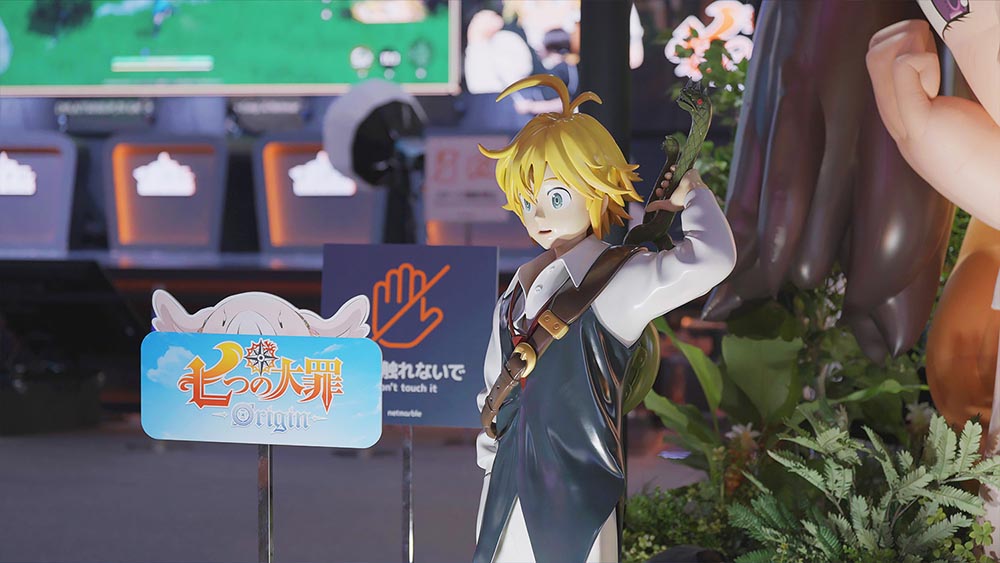 TGS 2025 넷마블 부스는 멀리서도 한 눈에 알아볼 수 있습니다. 바로 ‘일곱 개의 대죄: Origin’의 거대한 캐릭터 조형물 덕분이죠. 부스 위로는 <일곱 개의 대죄> 마스코트 캐릭터라 할 수 있는 ‘호크' 대형 풍선이 있으며, 시연존 옆에는 원작은 물론 이번 작품에도 등장하는 거인족 ‘다이앤’ 조형물이 배치되어 있습니다.