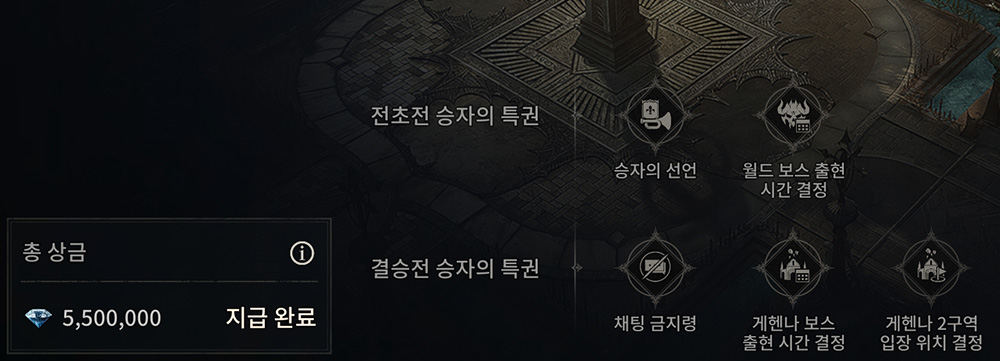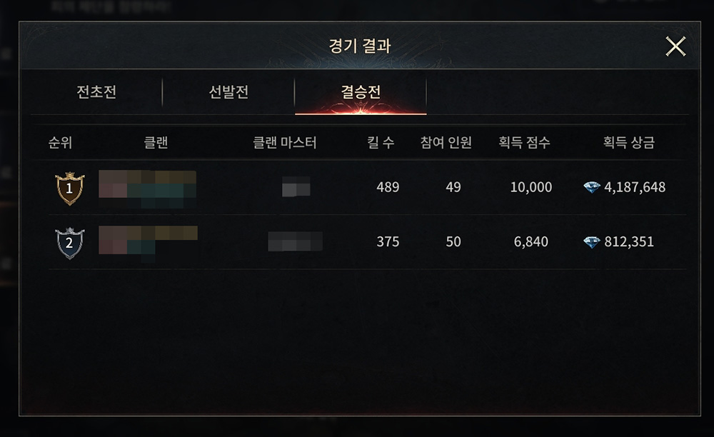 여기에 결승까지 진출한 클랜은 우승에 실패했더라도 획득 점수에 따라 결승전 상금으로 마련된 총 500만 다이아 중 일부를 나눠 가질 수 있습니다. 그 수량이 수십만 다이아는 되기 때문에 객관적 전력상 열세에 놓였더라도 최선을 다할 필요가 있죠.