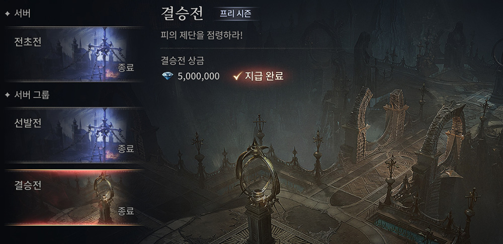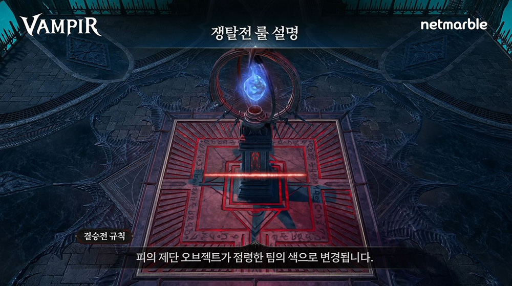 획득 점수를 토대로 승패가 가려진다는 점은 전초전·선발전과 동일하지만 점수 획득 방법은 다릅니다. 우선, 맵 가운데 부분에 위치한 5개 거점을 주목해야 하죠. 이 거점들은 4개 ‘피의 제단’과 정중앙에 있는 1개 ‘피의 대제단’으로 구성되어 있는데요. 제단 범위 안에 1개 클랜 소속 인원만 서있을 경우 점령이 시작되고, 점령 완료 이후부터 피의 제단은 5초마다 10점, 피의 대제단은 5초마다 20점의 점수를 얻게 됩니다.