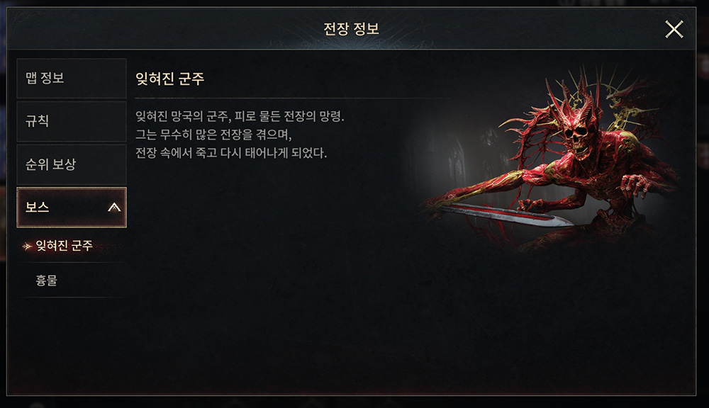 이어 지도상 12시, 6시 방향으로 돌출되어 있는 지역이 있습니다. 이곳에서는 보스가 출몰하죠. 먼저, 12시 지역에 나타나는 보스는 ‘잊혀진 군주’입니다. 결승전 시작 6분 경과 시 처음 등장하며, 처치 이후 5분마다 리스폰 되는 보스인데요. 처치 시 점수 500점과 전투에 유리한 버프를 얻을 수 있습니다. 그리고 6시 지역에 출몰하는 보스는 ‘흉물’로 시작 14분 경과 시 등장하며, 처치하면 다시는 나타나지 않습니다. 처치 보상으로는 1,500점 및 강력한 전투 버프가 있죠.