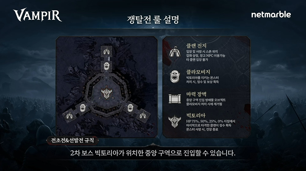 그런데 클랜 진지에서 맵 중앙으로 향하는 길목은 ‘마력 장벽’에 의해 차단되어 있습니다. 이를 해제하기 위해선 마력 장벽 앞에서 버티고 서있는 중간 보스 ‘클라모비지’를 먼저 처치해야 합니다.. 이후 중앙 구역에 들어서면 최종 보스 ‘빅토리아’를 만나게 됩니다. 빅토리아 처치 시 전초전·선발전이 종료되는데, 이 과정에서 HP 75%, 50%, 25%, 0% 등 체력 단계별로 ‘마지막 타격’을 한 클랜에게 큰 점수가 주어집니다. 3개 클랜이 뒤엉켜 보스를 공략하는 만큼, 마지막 타격으로 점수를 따기 위해서는 PvP를 통한 적절한 견제가 필요하죠.