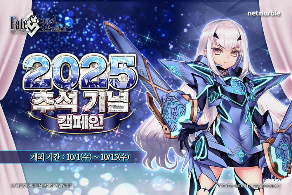 ‘페이트/그랜드 오더’에서는 ‘2025 추석 기념 캠페인’을 진행합니다. 캠페인 일환으로 성정석 30개, 전승 결정, 레어 프리즘 등을 로그인 보너스로 제공하고, 데일리 미션 클리어 추가 보상으로 '짐승의 발자국'을 14개까지 획득할 수 있습니다. 또한, 이벤트 한정 개념예장을 교환할 수 있는 상점 ‘개념 재상’이 업데이트돼 과거 기간한정 이벤트에서 등장했던 개념예장 7종을 만나볼 수 있는데요. 추석을 기념해 ★5(SSR) 멜뤼진(랜서)(요정기사 랜슬롯)을 획득할 수 있는 픽업도 진행되오니 많은 참여 바랍니다.