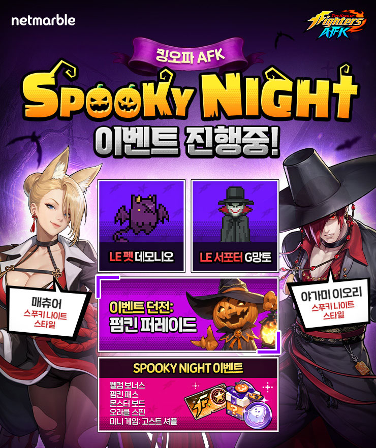 넷마블 수집형 RPG ‘킹 오브 파이터 AFK’에서 ‘스푸키 나이트’ 업데이트를 진행했습니다. 10월 23일에 진행된 업데이트는 플레이어들을 오싹하게 만들 ‘호러’ 테마를 내세우고 있는데요. 이러한 스푸키 나이트 스타일로 재해석된 2명의 인기 파이터가 게임에 출전합니다. 또한, 신규 펫들과 서포터도 만나볼 수 있죠. 대전격투 게임의 전설 ‘더 킹 오브 파이터즈(이하, KOF)' 속 수많은 파이터들을 다양한 모습으로 만나볼 수 있다는 점은 ‘킹 오브 파이터 AFK’의 핵심 재미라 할 수 있죠. 그럼 이번에 출시된 스푸키 나이트 스타일 파이터들은 누구이며, 어떤 외형을 갖췄는지 함께 살펴보도록 하겠습니다.