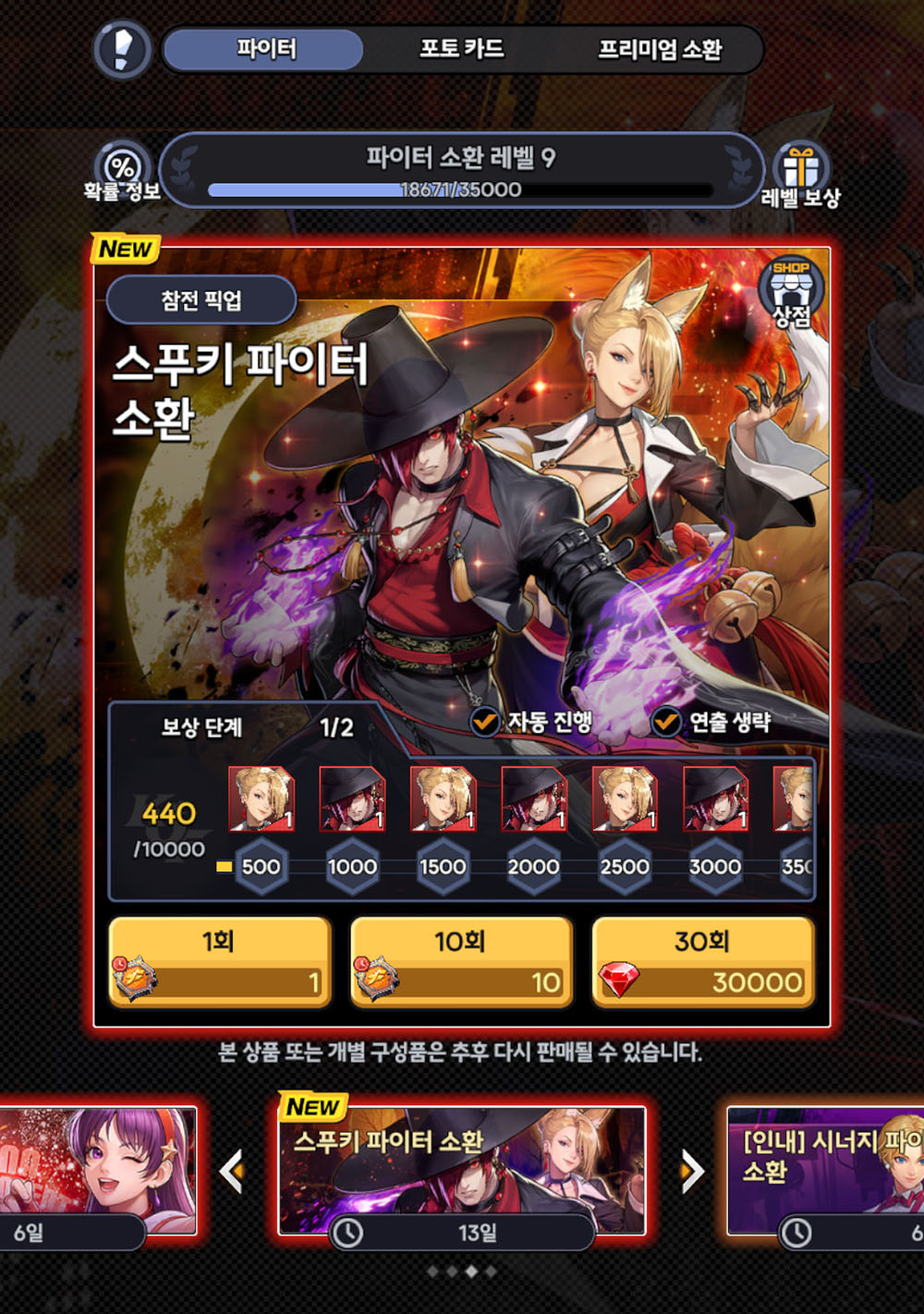스킬 명에서 짐작할 수 있듯 외형은 여우 요괴를 모티브로 합니다. 냉철한 성격을 지닌 악의 집단 여간부가 여우 귀와 꼬리를 달고 있는 모습에서 반전 매력이 느껴지기도 하네요. 2명의 파이터를 획득할 수 있는 픽업 소환 ‘스푸키 파이터 참전 픽업’은 오는 11월 5일까지 진행됩니다. 루비 또는 스푸키 파이터 토큰을 이용해 소환 시도를 할 수 있으며, 누적 소환 횟수에 따라 스푸키 스타일 파이터를 확정적으로 획득할 수 있죠. 이전 참전 픽업과 마찬가지로 ‘소환 레벨 3’부터 이용할 수 있다는 점 꼭 기억하시길 바랍니다.