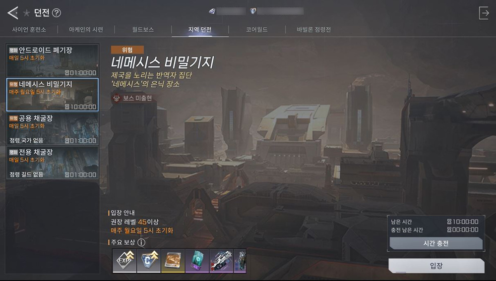 네메시스 비밀기지 5층의 입장 가능 레벨은 87 이상이며 109레벨 보스가 등장할 예정입니다