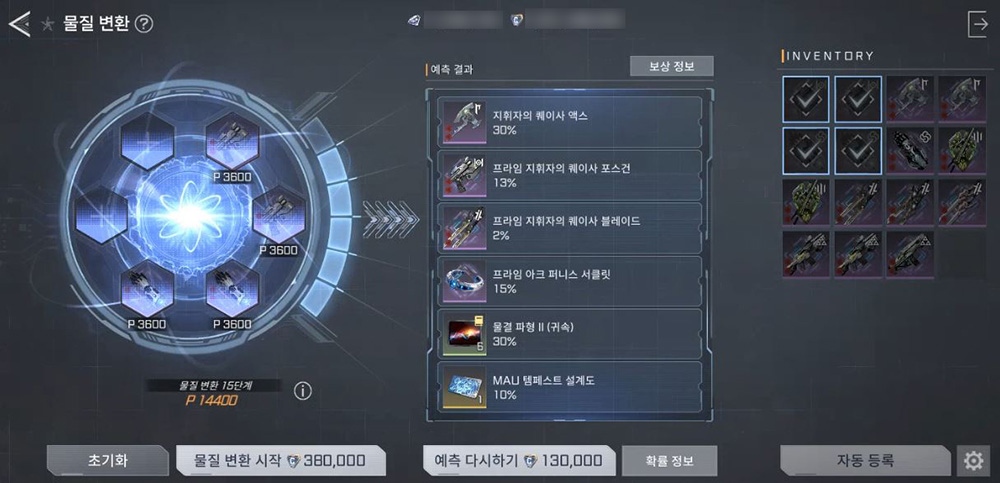 한편 물질 변환 단계는 기존 13단계에서 15단계로 2단계 확장되는데요. 14단계에서는 5티어 서클릿 및 3~4티어 영웅 장비를, 15단계에서는 4티어 영웅 프라임 장비 및 5티어 서클릿, MAU 템페스트 설계도 등을 확률적으로 획득할 수 있습니다.