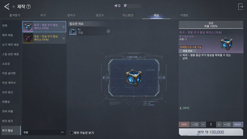 하위 등급 재료로도 상위 등급 상자를 확률적으로 제작할 수 있기에 열심히 플레이하는 용병에게도 높은 등급의 무기 형상을 얻을 수 있는 기회가 열렸습니다. 이미 보유한 무기 형상을 중복으로 획득할 경우, 동일한 등급의 재료 아이템으로 전환되어 인벤토리에 저장되므로 꾸준한 재료 수집과 제작을 통해 수집의 재미를 느끼실 수 있을 것으로 예상됩니다.