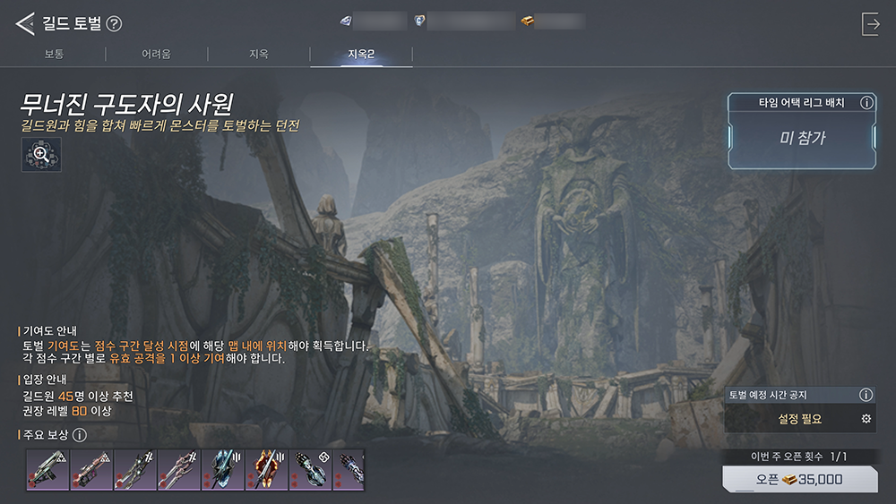 이번 업데이트로 새로운 시즌이 시작됐는데요. 기본 진행 방식은 동일하면서 몇 가지 굵직한 변경 사항도 확인할 수 있습니다. 변경점 중 처음 눈에 띄는 부분은 바로 난이도입니다. 기존에는 보통, 어려움, 지옥 3가지로 구분됐었는데, 이번 업데이트로 ‘지옥2’ 난이도가 추가됐습니다. 지옥2 난이도 권장 레벨 및 입장 길드원 수는 각각 80레벨·45명 이상이죠. 그간 용병 여러분들의 성장 수준을 반영한 난이도라 할 수 있죠.