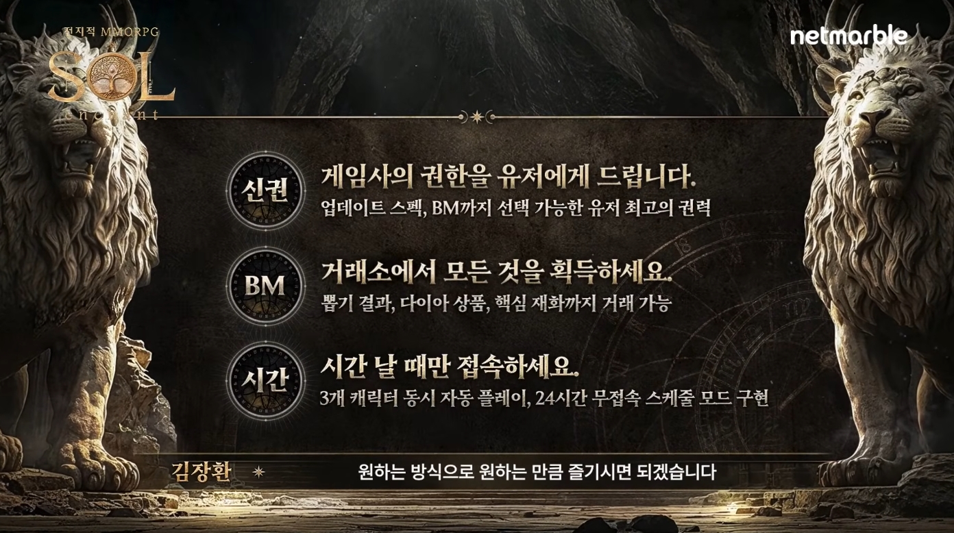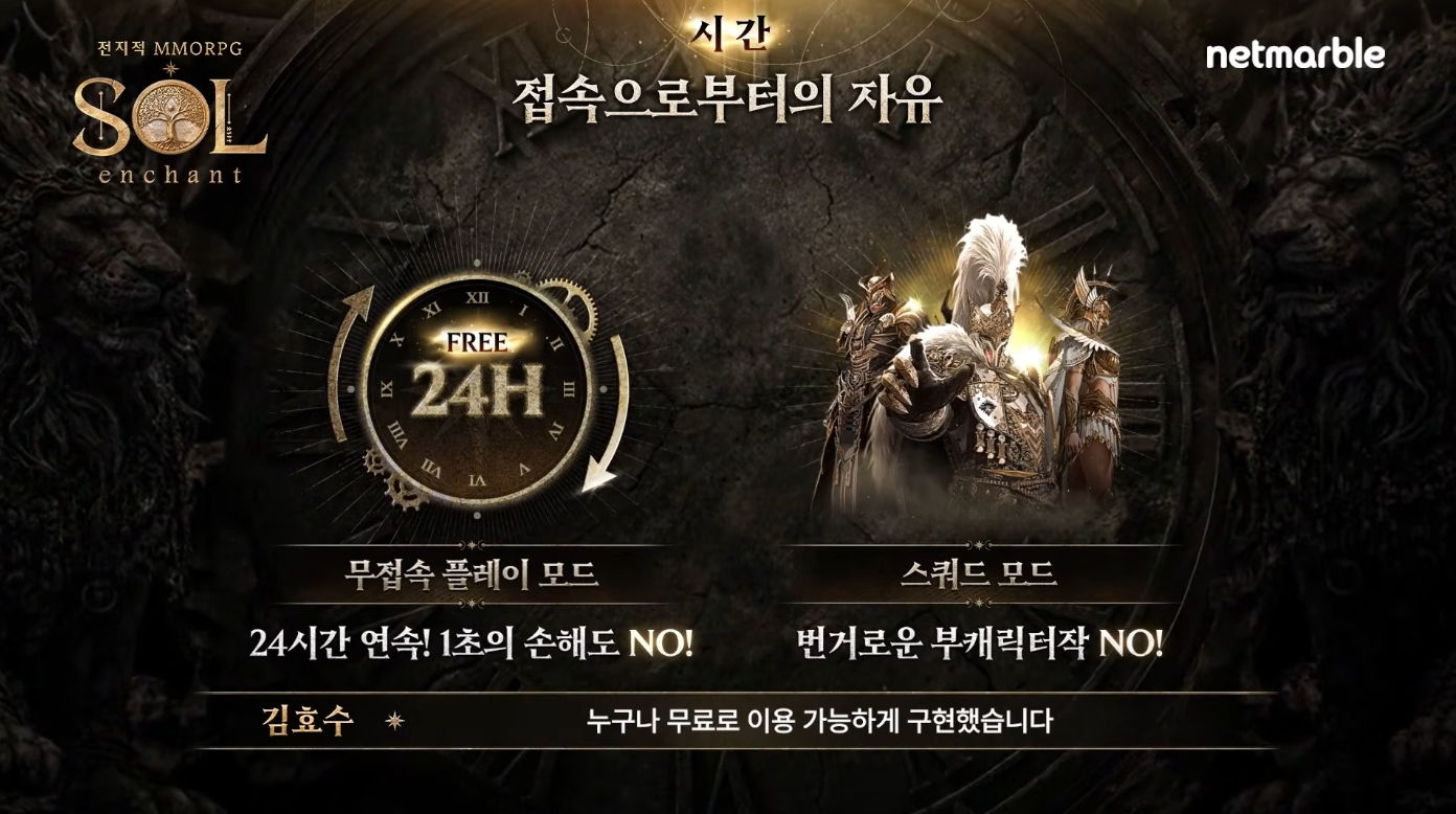 마지막은 편의 기능에 대한 소개가 이어졌습니다. 김효수 PD와 김장환 사업부장은 ‘시간’의 소중함을 강조하며, 접속 지표를 유지하기 위해 강제 접속을 유도하는 방식은 지양했다고 설명했습니다. 나아가 접속으로부터 자유로운 MMORPG라는 접근법으로 ‘SOL: enchant’ 편의기능을 구성했다고 전했죠.