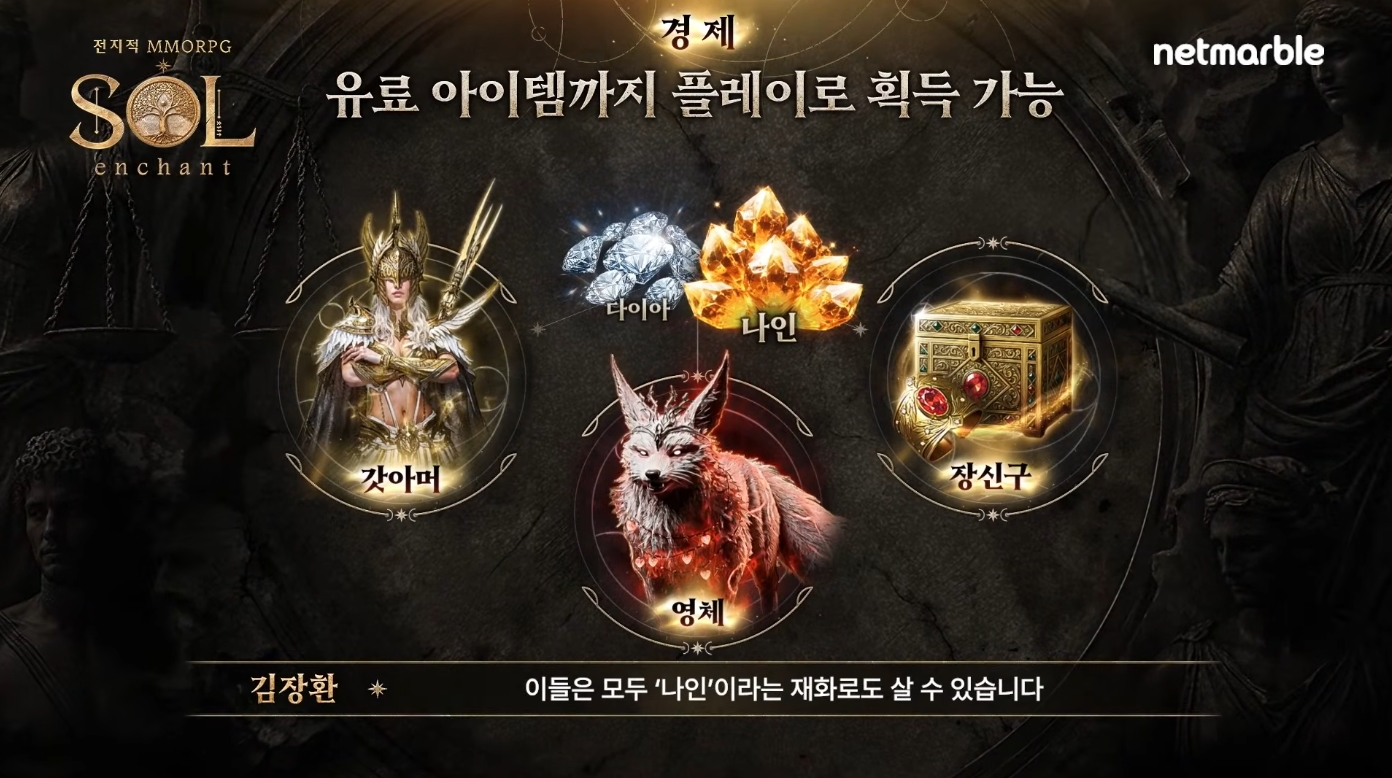 신권에 이어 BM과 경제, 편의 기능 등 유저들이 궁금해할 만한 핵심 요소들이 차례로 소개됐습니다. 먼저, ‘SOL: enchant’’에서는 유료 아이템까지 거래할 수 있다는 점이 특징입니다. 유료 재화 ‘다이아’로 갓아머와 영체를 뽑거나, 장신구를 구매하는 방식은 기존 다른 게임과 유사하지만, 이 모든 것을 거래할 수 있다는 점에서 차별화를 두었습니다. 또한, 갓아머와 영체는 ‘추출’이라는 시스템을 통해 소환권 형태의 아이템으로 전환한 뒤 거래할 수 있습니다.