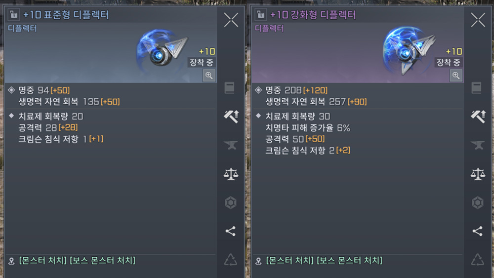 신기 사용 불가 및 1% 지속 피해는 원활한 던전 플레이를 어렵게 만드는 치명적 디버프인 만큼, 용병 여러분은 침식 단계를 최소한 2단계 이하로 유지할 필요가 있는데요. 새롭게 추가된 저항 버프 물약을 사용하거나, 신규 익스펜션 ‘디플렉터’를 장착하여 상쇄할 수 있습니다. ‘디플렉터’는 알베른 디버프를 감소시키는 익스펜션 ‘드라이브’와 마찬가지로 희귀와 영웅 2가지 등급으로 구분되고, 강화도에 따라 디버프 저항력이 높아집니다.