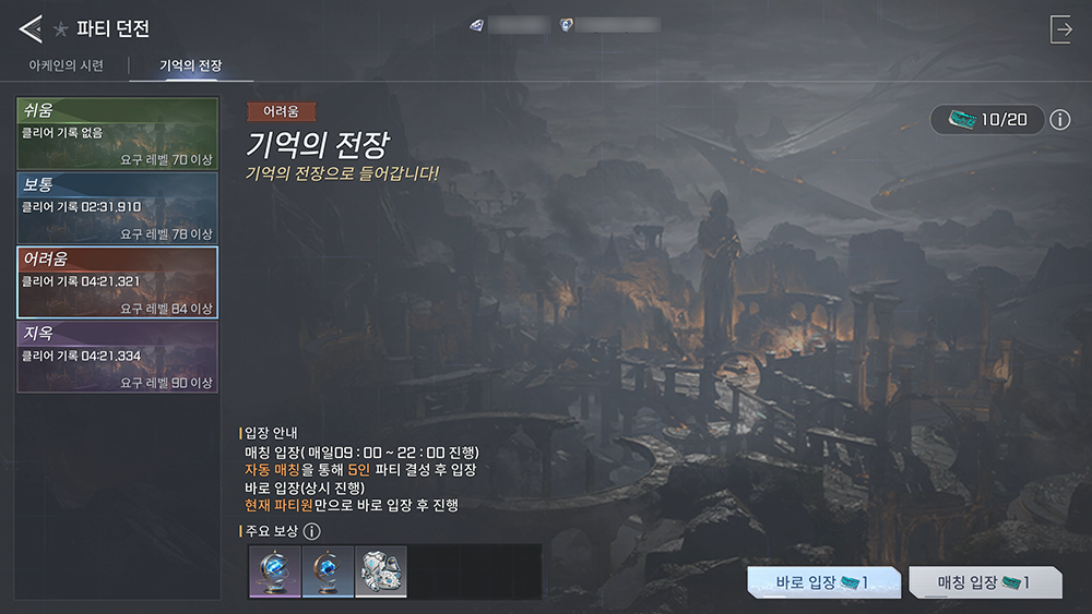 MMORPG의 핵심 재미는 협동과 경쟁, 이 중 협동의 재미를 강화할 새로운 파티 던전 ‘기억의 전장’이 추가됩니다. 해당 던전 난이도는 쉬움, 보통, 어려움, 지옥 4단계로 나뉘어져 있는데요. 기존 파티 던전 ‘아케인의 시련’과는 횟수를 공유하지 않는 독자적인 입장권을 사용해 입장 가능합니다. 이미 파티를 맺고 있는 상태에서 해당 입장권을 사용하여 24시간 상시 입장할 수 있고, 매일 19시에서 21시 사이에는 랜덤 매칭을 통해서도 입장이 가능합니다.
