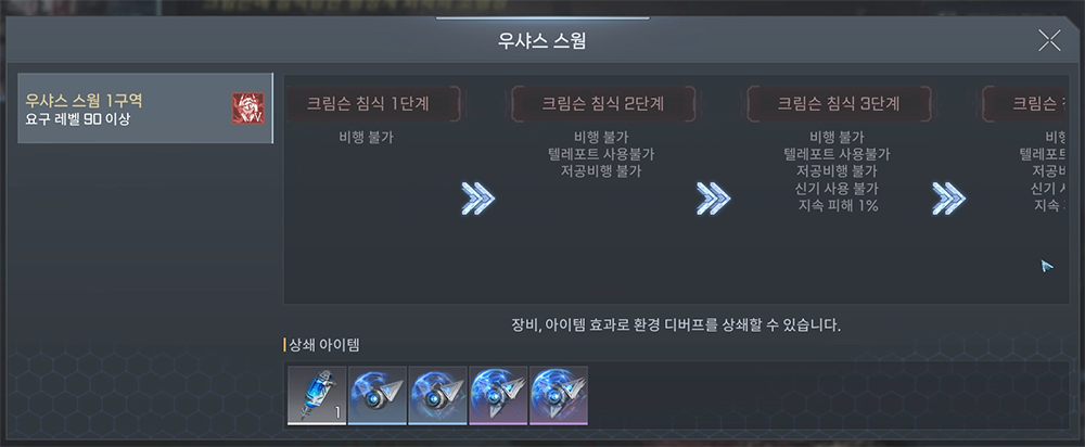 우샤스 스웜에 입장하면 5단계의 강력한 크림슨 침식 디버프를 받게 됩니다. 침식 1단계에서는 바이오슈트를 이용한 비행이 불가하며, 2단계에서는 1단계 디버프와 텔레포트 사용 불가 및 저공비행 불가가 더해집니다. 3단계에서는 신기를 사용할 수 없으며, 1% 지속 피해까지 받게 되죠.
