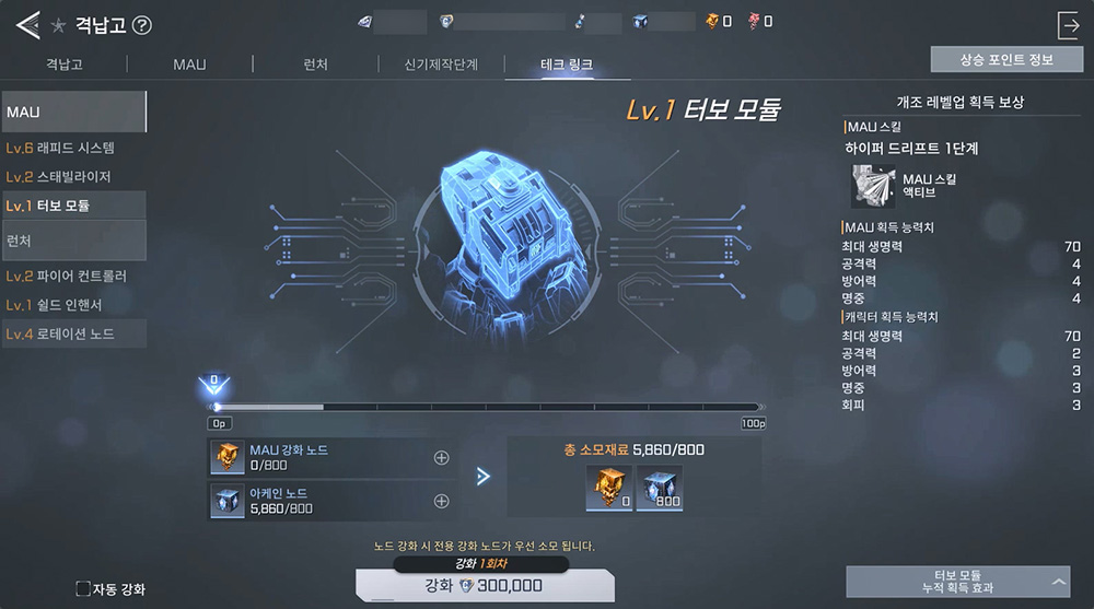 신기 성장 요소도 확장됐습니다. 신기를 더욱 강력하게 해줄 신규 테크링크 2종 카테고리가 새롭게 오픈됐습니다. MAU에는 ‘터모 모듈’, 런처에는 ‘로테이션 노드’가 각각 추가됐죠. 터모 모듈과 로테이션 노드 강화에는 기존 테크 링크 성장에 쓰이는 재료로 제작할 수 있는 신규 성장 아이템이 요구됩니다. 또한, 해당 테크 링크를 통해 신기 탑승 및 소환 시 새로운 스킬도 사용할 수 있는데요. 한층 더 강력해진 신기를 전장에서 잘 활용해보시길 바랍니다.