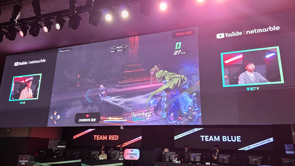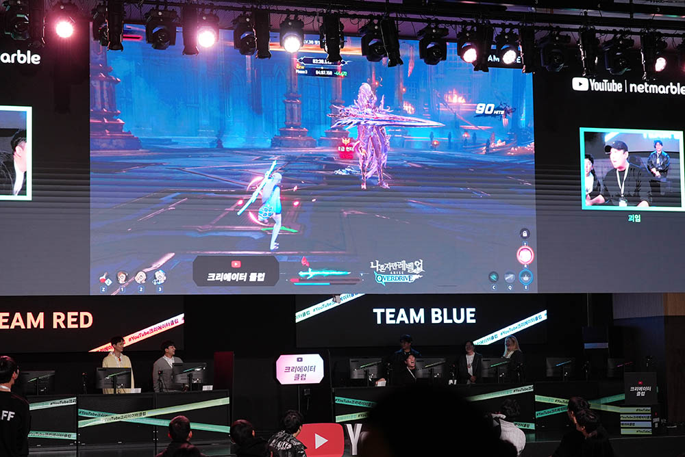 대결에 참가한 영상 크리에이터는 무빙TV, MR.훈, 오지조, 괴임 등 4명으로 무빙TV와 MR.훈이 ‘팀 레드’, 오지조와 괴임이 ‘팀 블루’로 합을 맞췄습니다. 행사 메인 MC를 맡은 남도형 성우와 해당 코너 특별 MC 김규환 캐스터의 중계는 양 팀 간 대결에 박진감을 더했죠. ‘나 혼자만 레벨업’ 팬들에게는 매우 익숙한 ‘핏빛의 이그리트'를 먼저 쓰러뜨린 팀은 바로 무빙TV와 MR.훈의 팀 레드였습니다.