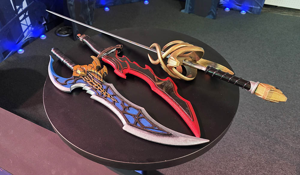 포토존부터 먼저 둘러보겠습니다. 이곳에는 성진우 각성의 계기가 된 ‘이중던전 사건’에 등장하는 거대 석상들의 패널이 설치되어 있었습니다. 또, 실제 작중에서 성진우가 사용하는 ‘카사카의 독니’, ‘나이트 킬러’와 S급 헌터 차해인이 사용하는 레이피어 등 무기 모형도 있었죠. 즉, 카르테논 신전에 입장한 ‘헌터’처럼 기념 사진을 남길 수 있었습니다.