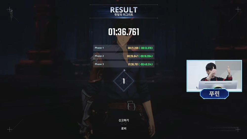 막간을 이용해 팀 간 치열한 신경전이 전개된 후, 푸린과 닛몰캐쉬 팀이 먼저 도전에 나섰습니다. 이번 전장에서 만나게 된 보스는 ‘핏빛의 이그리트’였죠. 푸린과 닛몰캐쉬는 게임 시작 30초 남짓 만에 보스방에 진입했고, 결국 1분 36초 기록을 남겼습니다. 옥냥이와 일오팔 팀은 일오팔이 의상에 달린 날개를 떼어내는 퍼포먼스를 보이며 전의를 불태웠지만, 클리어 타임 2분 31초를 기록하며 패배하게 됐죠.