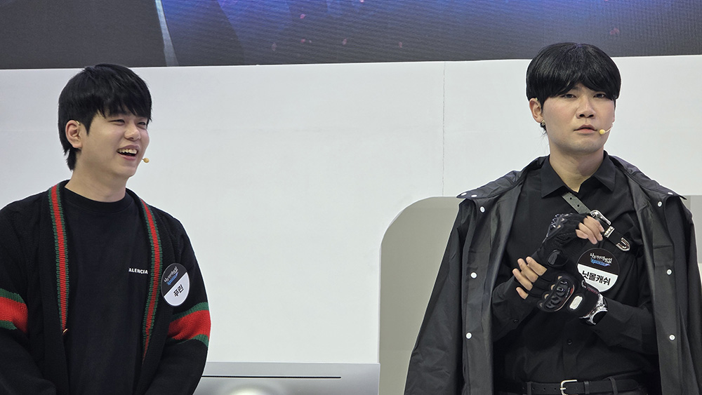 먼저 무대에 오른 것은 프로그램 진행을 맡은 박상현, 김규환 캐스터였습니다. 이들은 이벤트 참여 방식을 설명한 다음, 대결을 펼칠 푸린, 닛몰캐쉬, 옥냥이, 일오팔 4명의 크리에이터를 무대로 불렀습니다. 그런데 이 순간, 2명의 캐스터는 물론 관람객들까지 웃음을 터뜨렸죠. 그 이유는 바로 출연진의 분장 때문이었습니다.