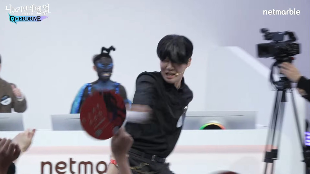 우선, 닛몰캐쉬는 ‘성진우’ 코스프레를 한 채 무대에 올라 카리스마가 느껴지는 표정과 몸짓을 지었습니다. 그리고 일오팔은 그림자 군단 중 성진우의 최측근이라 할 수 있는 ‘베르’로 변신한 모습으로 등장했는데요. 원작과는 약간(?) 다른 외형으로 큰 재미를 선사했습니다. 참고로 원작 그림자 군단 중 베르를 가장 좋아한다고 말한 푸린이 “베르가 아닌 팅커벨이 왔다”고 말할 정도의 독특한 분장이었죠. 닛몰캐쉬와 일오팔은 “일어나라”라는 대사와 함께 그림자를 추출하는 명장면을 재현하는 퍼포먼스도 펼치며 분위기를 띄웠습니다.
