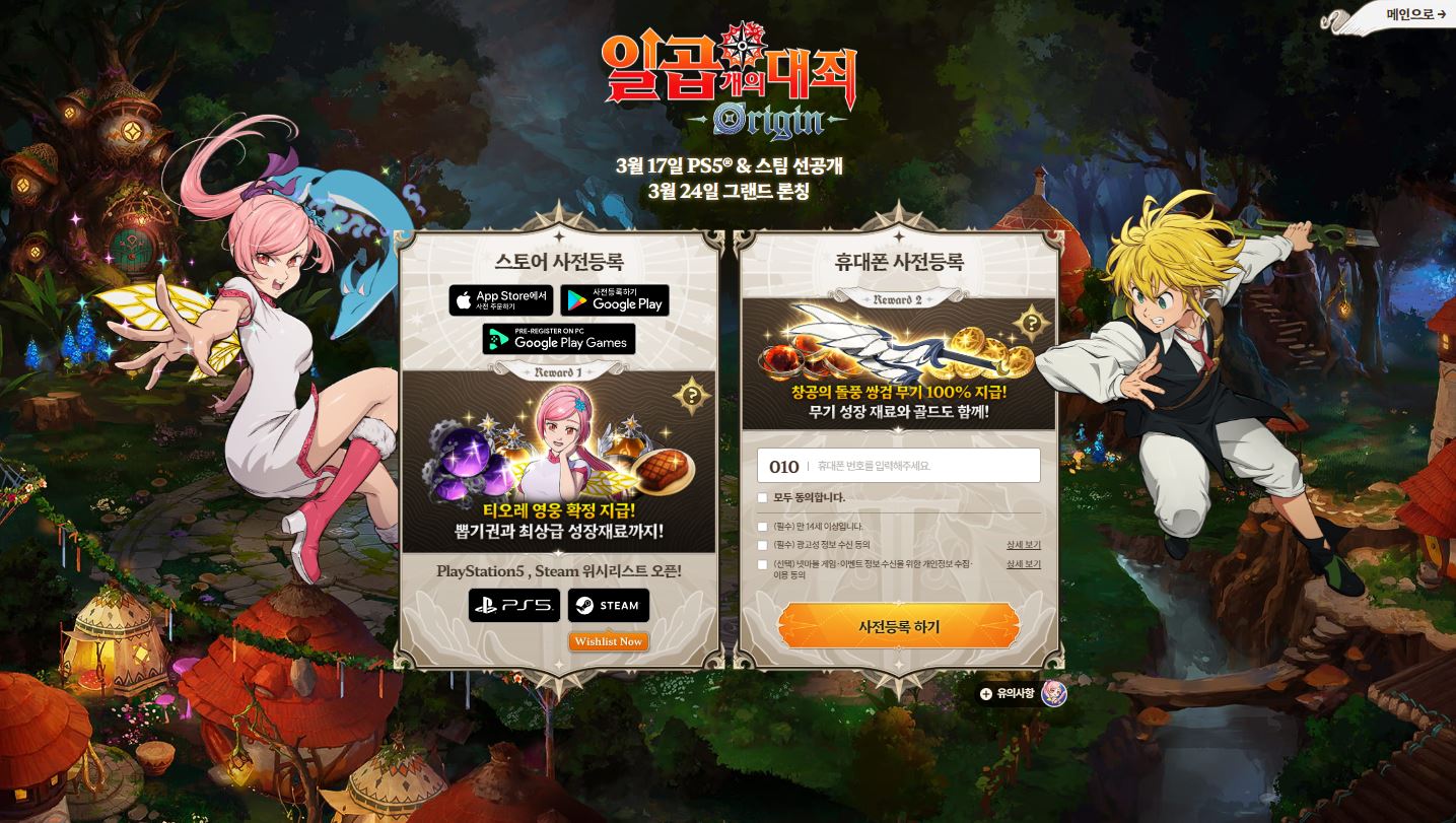 <일곱 개의 대죄: Origin>은 현재 사전등록 진행 중입니다. 공식 홈페이지에서 휴대폰 번호를 입력하여 간편하게 참여하실 수 있으며, 모바일 버전은 애플 앱스토어와 구글 플레이스토어에서, PC버전은 구글 플레이 게임즈를 통해 사전등록이 가능합니다. 사전등록 이벤트에 참여하면 ‘티오레’ 영웅 뽑기권, 최상급 성장 재료, 창공의 돌풍 쌍검 무기 보상을 얻을 수 있습니다.