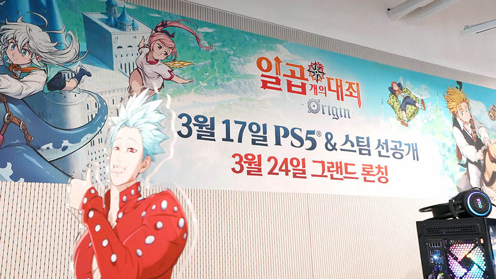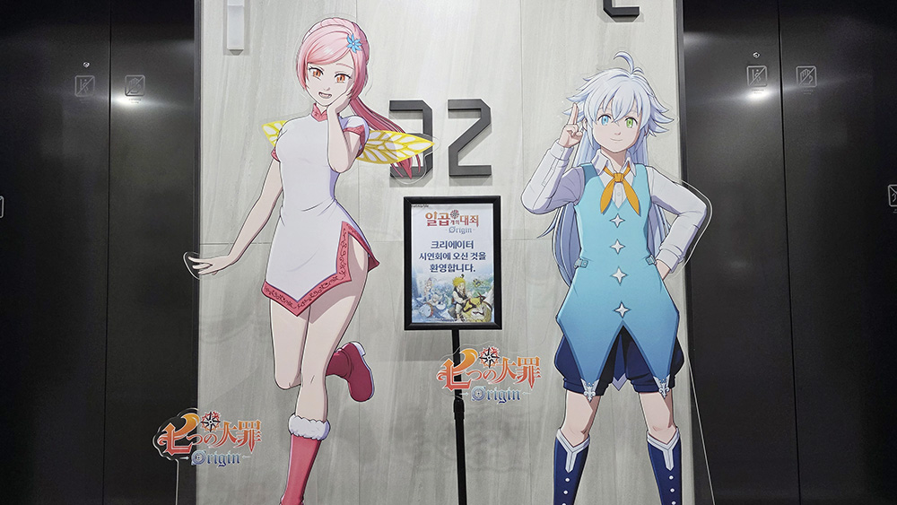 <일곱 개의 대죄: Origin> 크리에이터 시연회는 3월 5일, 넷마블 사옥 지타워 32층에서 열렸습니다. 행사장 앞에는 이번 작품 서사를 이끄는 2명의 등장인물 ‘트리스탄’과 ‘티오레'의 실제 비율 아크릴 스탠드가 환영 인사를 건넸습니다. 그럼 행사장 안으로 들어가 보도록 하겠습니다.