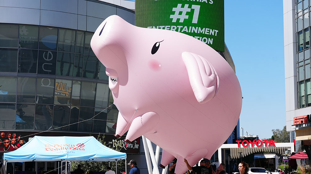 현장을 찾은 관람객들을 가장 먼저 반긴 것은 ‘호크’였습니다. 말하는 돼지인 호크는 <일곱 개의 대죄: Origin>의 마스코트 캐릭터이기도 하죠. LA Live 야외 광장 한가운데 띄워진 호크 대형 풍선은 흥미로운 볼거리이면서, 관람객들이 멀리서도 행사장을 한 눈에 확인하고 찾아올 수 있도록 하는 ‘길 안내’ 역할까지 수행했습니다.