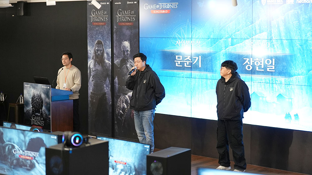 본격적인 행사는 오후 1시 30분부터 시작됐습니다. ‘왕좌의 게임: 킹스로드’ 개발을 총괄하는 넷마블네오 장현일 총괄 PD를 비롯해 넷마블 문준기 사업본부장과 박시형 사업부장 등 주요 관계자들이 무대에 올라 참가자들에게 감사 인사를 전했습니다. 이후 행사 진행 방법과 게임 소개가 이어졌습니다.