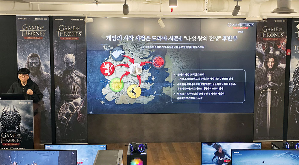 게임 소개는 장현일 PD가 맡아 상세한 설명이 이어졌습니다. ‘왕좌의 게임: 킹스로드’는 원작 드라마 시즌4 ‘다섯 왕의 전투’ 후반부를 배경으로 이야기가 전개되는데요. 유저는 북부의 한 몰락해가는 가문의 서자가 되어 오픈월드로 구현된 웨스테로스 대륙을 모험하게 됩니다.