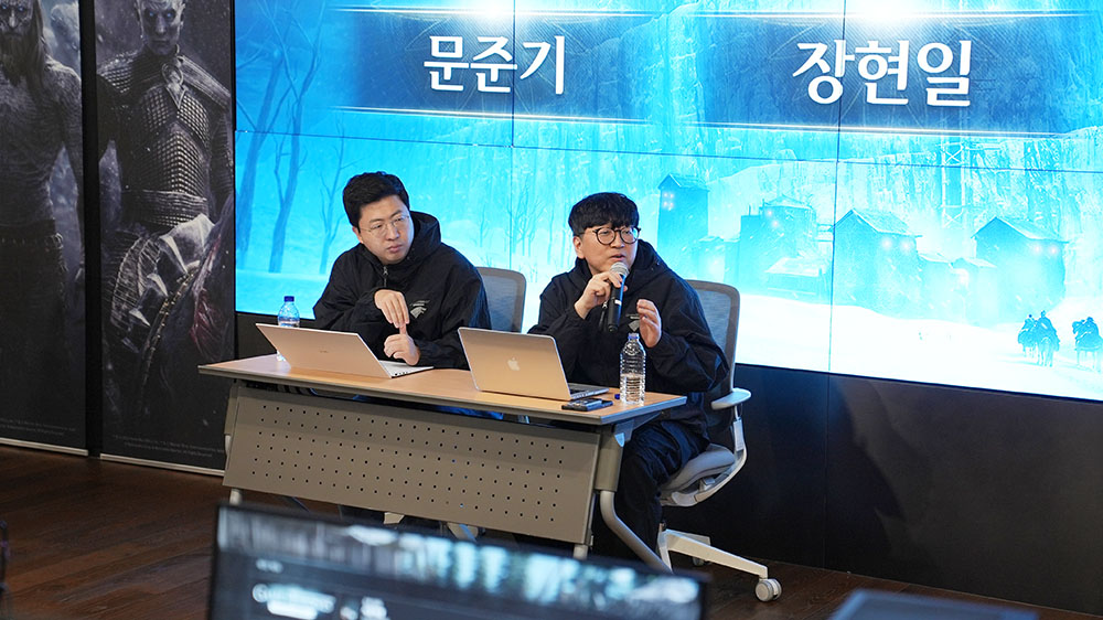 2차에 걸친 게임 체험이 마무리된 후, 장현일 PD와 문준기 본부장이 다시 무대에 올라 참가자들과 Q&A 시간을 가졌습니다. 참가자들은 게임을 체험해보면서 들었던 궁금증은 물론, 좋았던 부분과 앞으로 개선했으면 하는 점까지 이야기하며 게임에 대한 적잖은 기대감을 표했습니다.