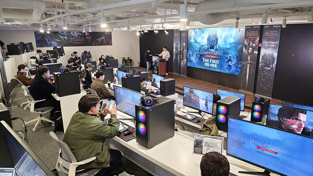 ‘왕좌의 게임: 킹스로드’ 유저 시연회 참가자들은 행사 시작 전, 넷마블 지타워 3층에 위치한 사내카페 ‘ㅋㅋ다방’에 모였습니다. 이후 넷마블 관계자의 안내에 따라 32층에 마련된 게임 체험 공간으로 이동했는데요. 현장에는 20대 이상의 고사양 PC가 준비되어 있었으며, 다과와 음료는 물론, 넷마블이 정성껏 준비한 ‘왕좌의 게임: 킹스로드’ 굿즈 꾸러미도 함께 제공됐습니다.
