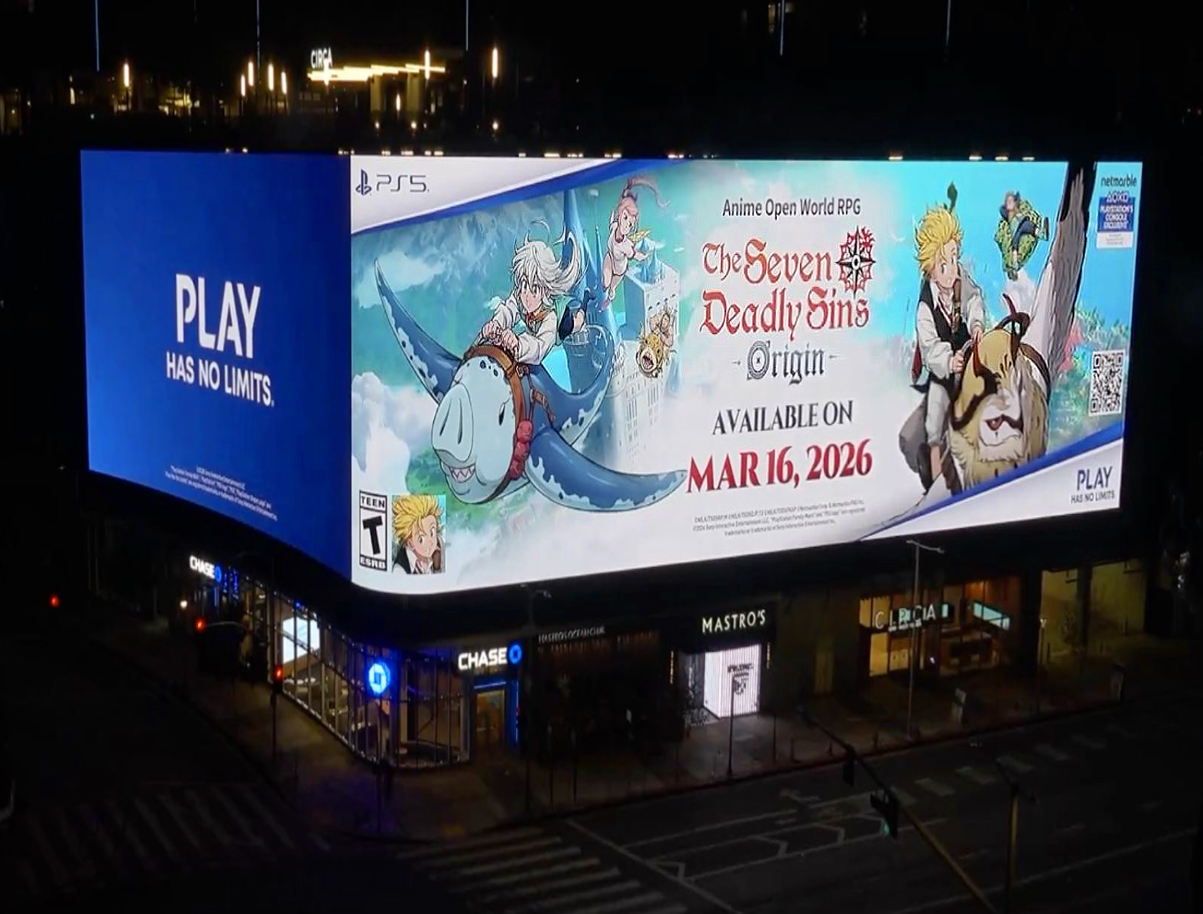 미국에서는 세계적인 명소인 뉴욕 타임스퀘어의 프리미엄 전광판을 <일곱 개의 대죄: Origin> 영상으로 도배해 브랜드 각인 효과를 노린다. 또한 LA의 대표적 핵심 상업 지역인 LA Live에서도 대형 광고를 집행한다. 미국은 원작 '일곱 개의 대죄' IP 팬층이 확고한 지역 중 하나로 꼽힌다.